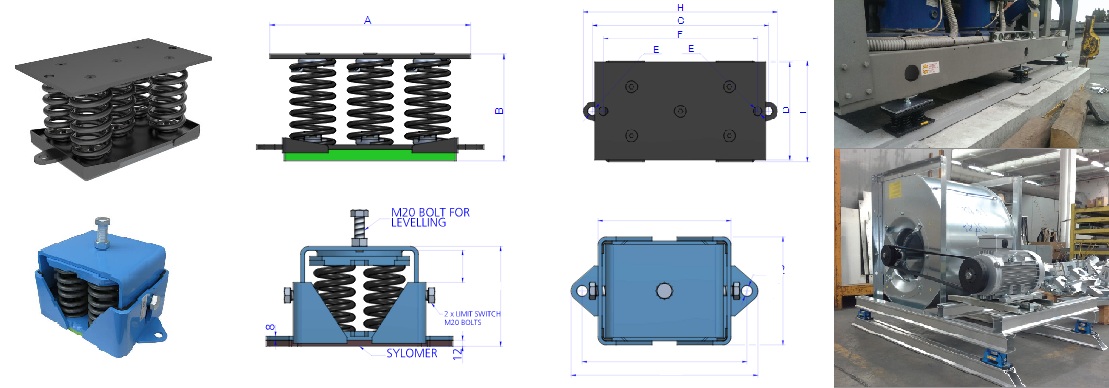 Основной характеристикой виброопор является их способность изолировать очень низкие возмущающие частоты. Эти изделия выдерживают широкий диапазон нагрузок. Виброопоры в антисейсмическом исполнении имееют защиту пружины от землетрясений. Они разработаны таким образом, чтобы обеспечить высокую надежность изоляции низкочастотных вибраций. В дополнение к их стойкости, для эти изделия оснащены блокирующим устройством, так что кронштейны блокируются во время транспортировки оборудования, также в изделии установлена прокладка из полиуретана с микроэлементами, которая изолирует средние и высокие частоты, передаваемые пружиной, тем самым обеспечиваются условия шумоизоляции. Применяются для виброизоляции вентиляторов, кондиционеров, чиллеров, компрессорных установок, насосов и другого оборудования.