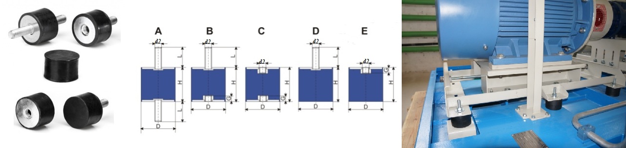 Цилиндрические виброопоры, виброизоляторы, резиновые амортизаторы. Идеально подходят для поглощения вибрации, создаваемой вентиляторами, насосами, электрическими двигателями, шкафами управления и другим промышленным оборудованием. Преимущества: простота сборки, высокая гибкость, экономичность, длительный срок службы. Температура применения от -40°С до +80°С. Возможно изготовление из нержавеющей стали. Твердость резины по Шору: 45 (мягкая), 55-60 (средняя), 70(твердая).